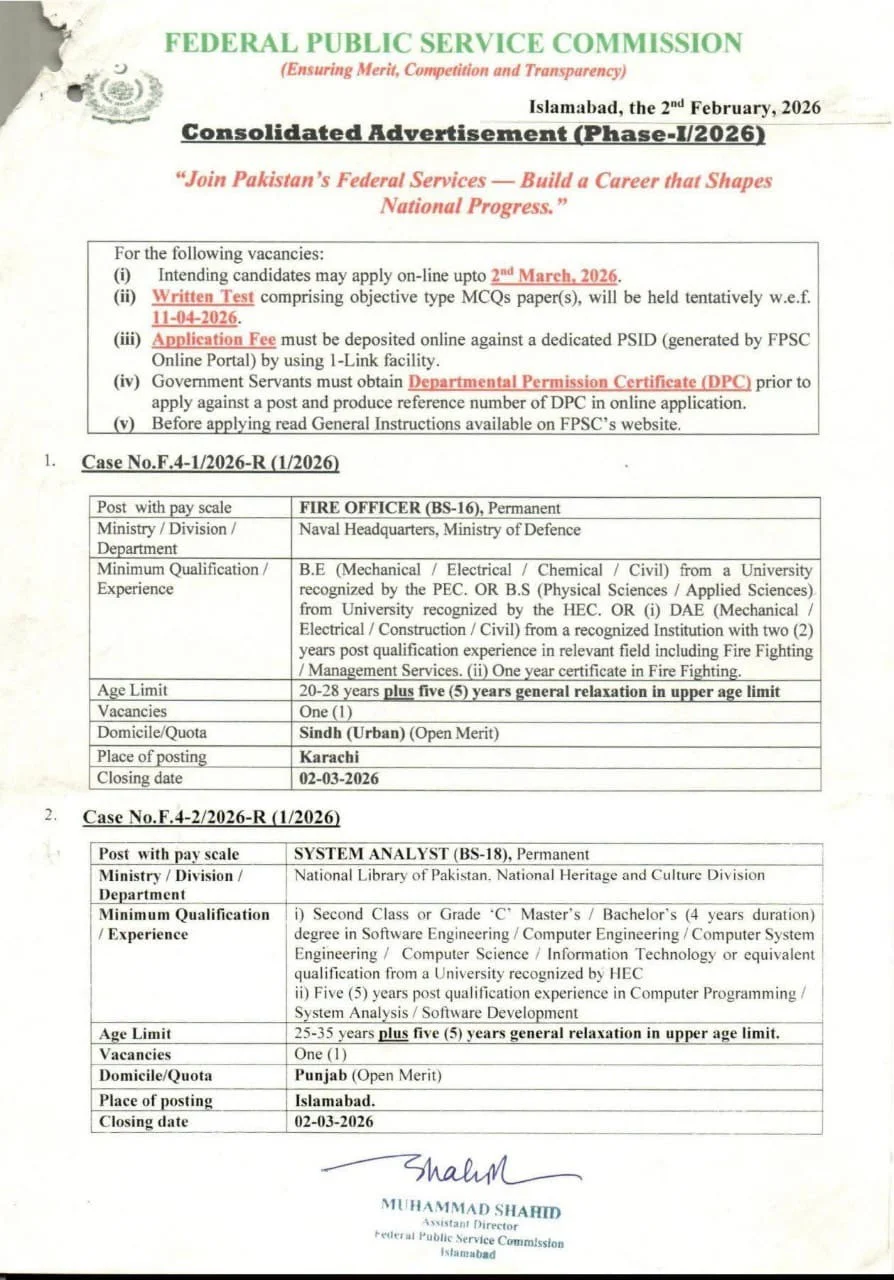 Hi everyone, FPSC new jobs 2026 are now available. Two positions are available for Fire Officer (BS-16) and System Analyst (BS-18).  The Federal Public Service Commission offers jobs in Islamabad. Case No. F.4-1/2026-R (1/2026) for Fire Officer and Case No. F.4-2/2026 (1/2026) for System Analyst. The complete details are as follows.